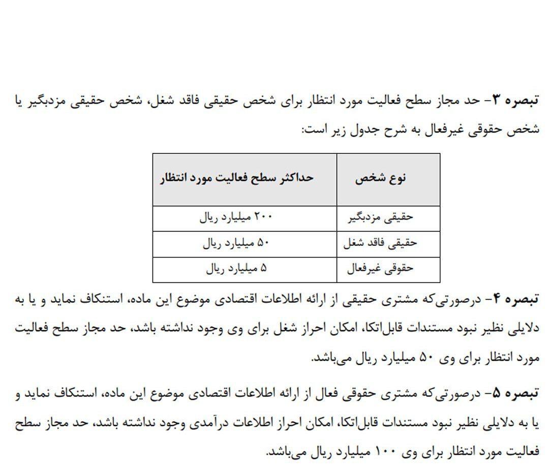 🔹براساس این بخشنامه سقف فعالیت بر اساس نوع مشتری تعیین شده است؛ سقف فعالیت برای مشتریان حقیقی مزدبگیر ۲۰ میلیارد تومان، حقیقی بدون شغل ۵ میلیارد تومان و برای مشتریهای حقوقی غیرفعال ۵۰۰ میلیون تومان است.